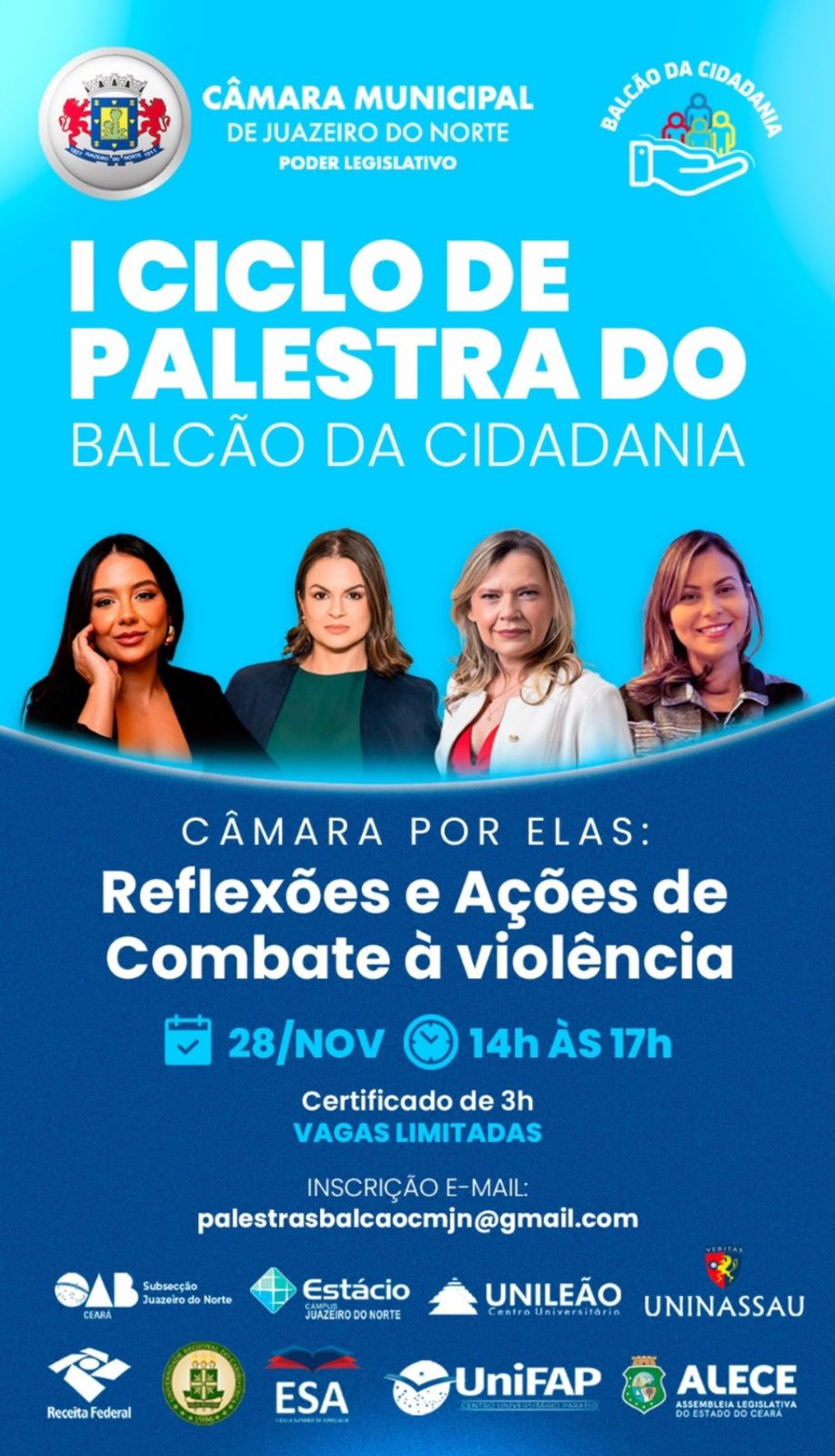 Na próxima quinta-feira (28), a Câmara de Vereadores de Juazeiro do Norte sediará a palestra “Câmara por Elas: Reflexões e Ações de Combate à Violência contra a Mulher”. O evento, que é promovido pelo Balcão da Cidadania, abordará questões essenciais relacionadas ao enfrentamento da violência de gênero, com uma programação enriquecedora.
